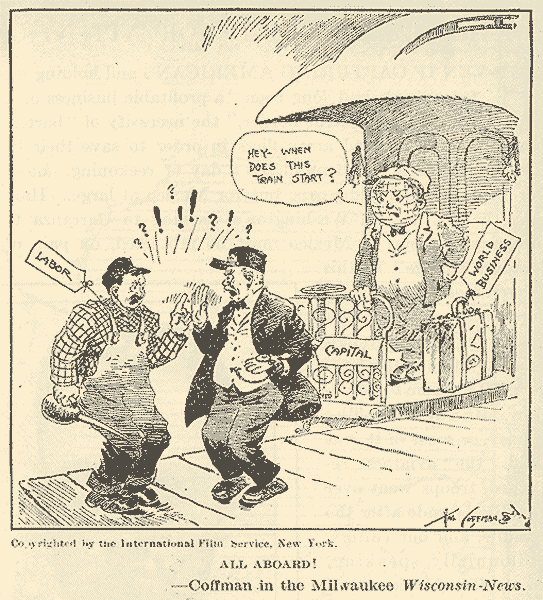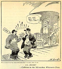 All Aboard! Literary Digest, 8/30/19. Originally from the Milwaukee Wisconsin-News (Coffman). political cartoon